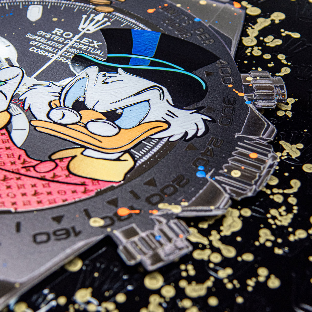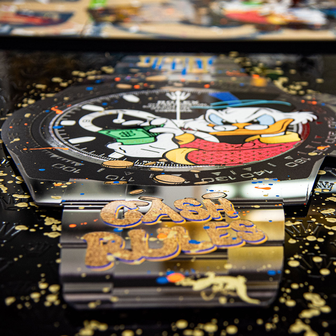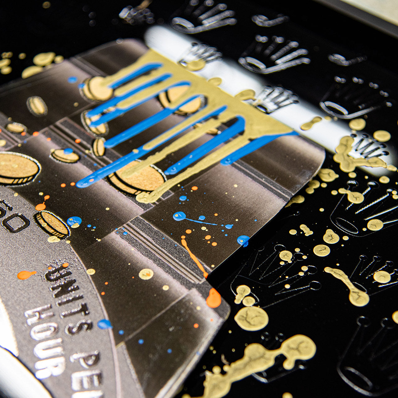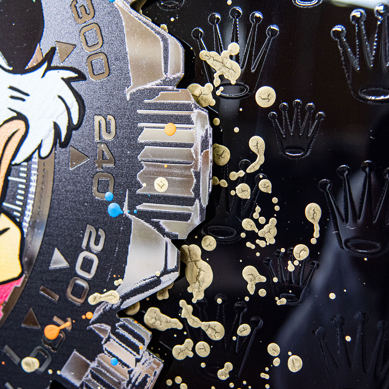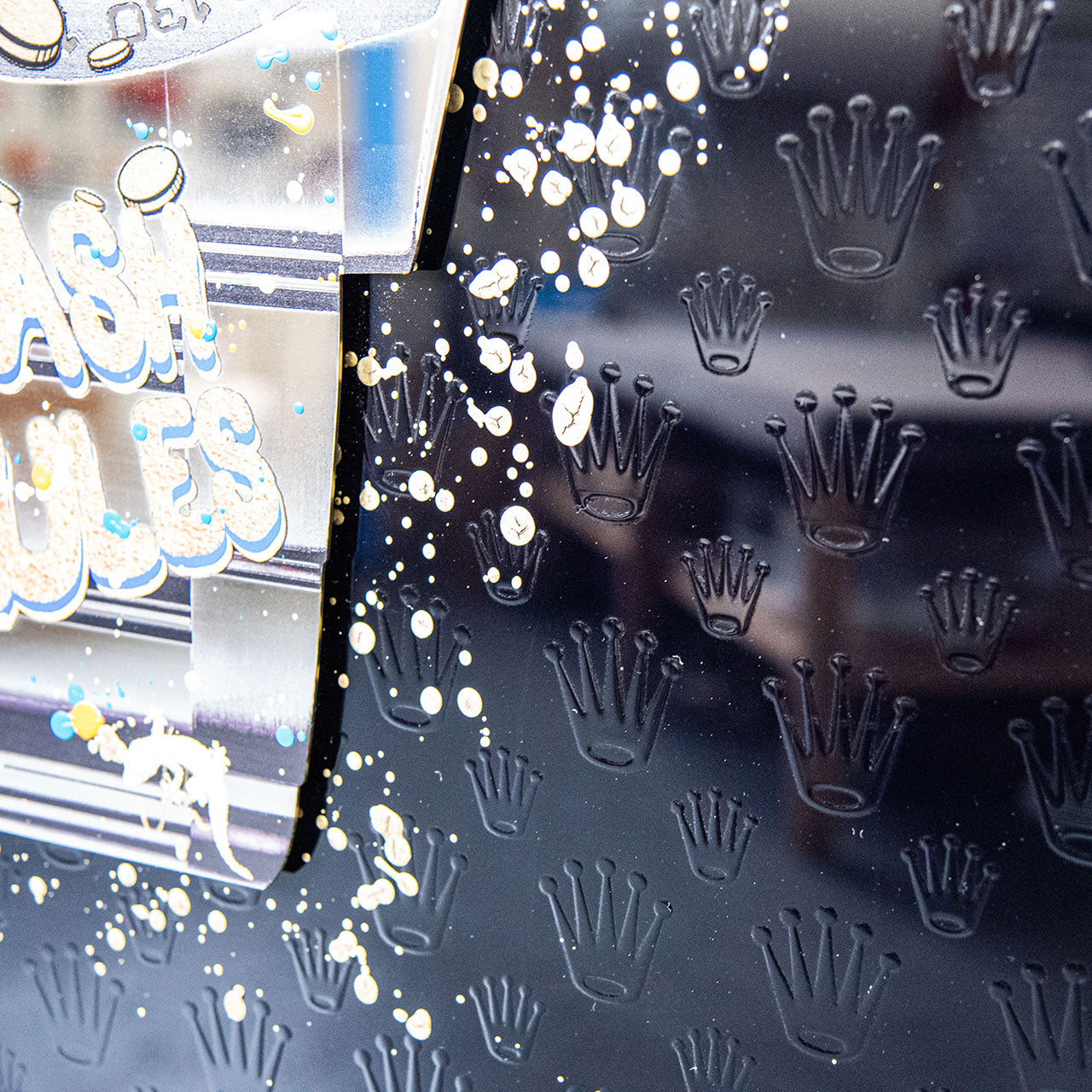 Die Edelstahlplatte hängt schwebend vor einer schwarzen Plexiglas-Hintergrundplatte, wodurch eine deutliche Tiefenwirkung entsteht. Auf das Plexiglas ist die ikonische Rolex-Krone mehrfach in Lack aufgetragen – subtil glänzend, rhythmisch wiederholt und beinahe ornamental. Dieses Motiv bildet einen visuellen Kontrast zur freien, expressiven Gestaltung der Vorderplatte und unterstreicht die thematische Auseinandersetzung mit Luxus, Zeit und Statussymbolen.