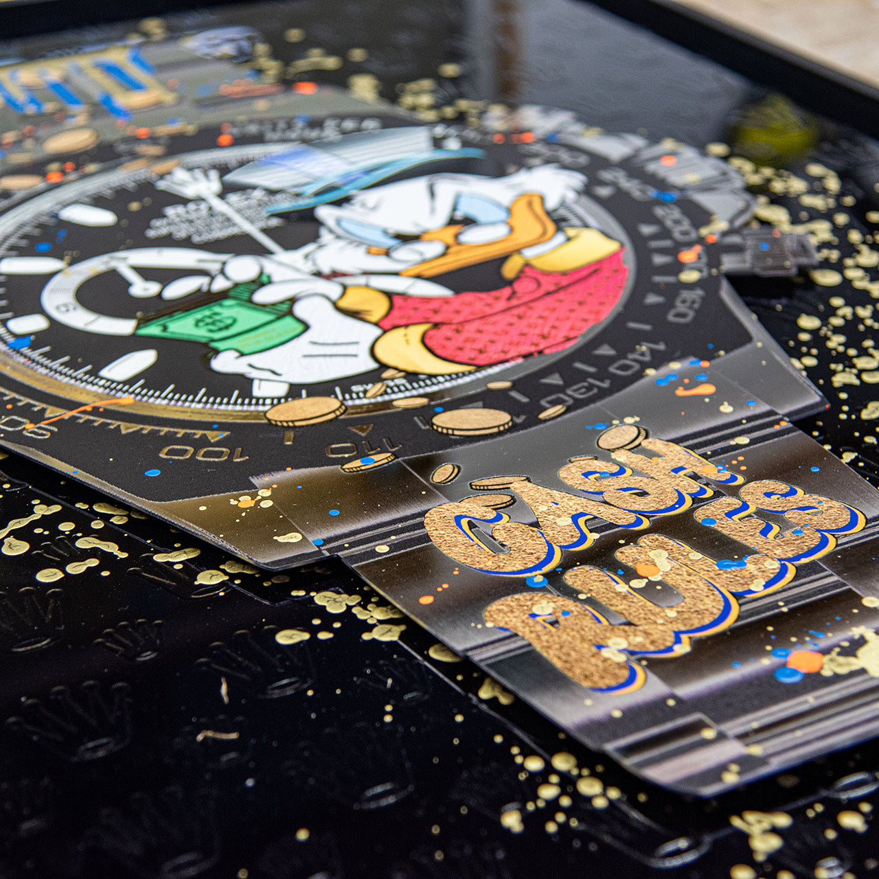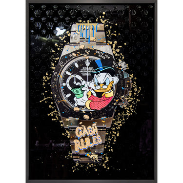 Eingefasst ist das Werk in einen schwarzen, pulverbeschichteten Schattenfugenrahmen, der die Tiefenstaffelung bewusst betont und dem Kunstwerk eine klare, moderne Rahmung verleiht. So entsteht eine kraftvolle, zeitgenössische Arbeit mit starker Präsenz, die Pop-Kultur, Luxusästhetik und hochwertige Materialverarbeitung auf eindrucksvolle Weise vereint.